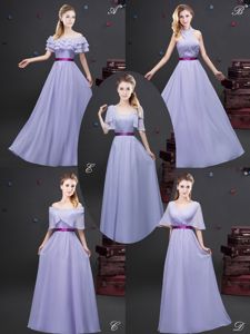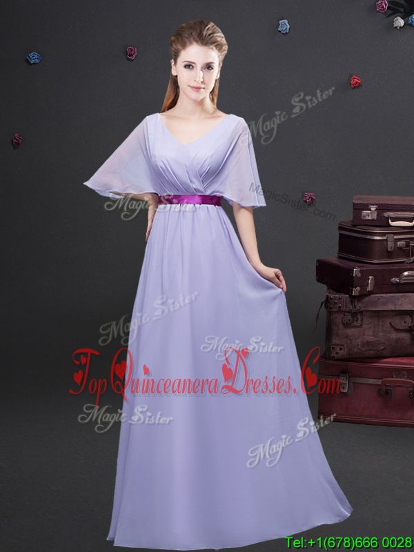 Discount Lavender V-neck Neckline Ruching and Belt Quinceanera Court of Honor Dress Half Sleeves Zipper