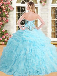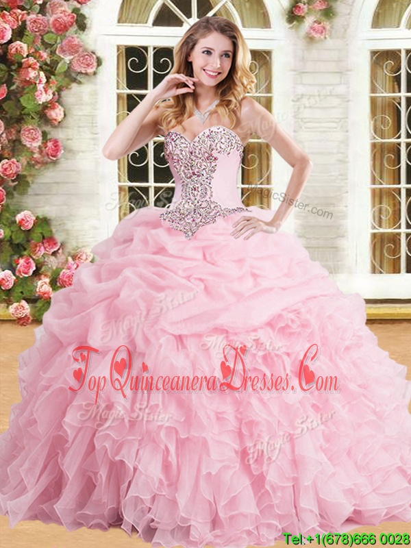 Discount Organza Sweetheart Sleeveless Lace Up Appliques and Ruffles and Pick Ups Quinceanera Gowns in Baby Pink