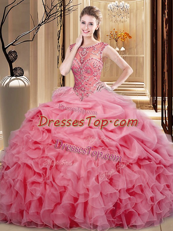 Discount Pink Ball Gowns Scoop Sleeveless Organza Floor Length Lace Up Beading and Ruffles and Pick Ups Quinceanera Gown