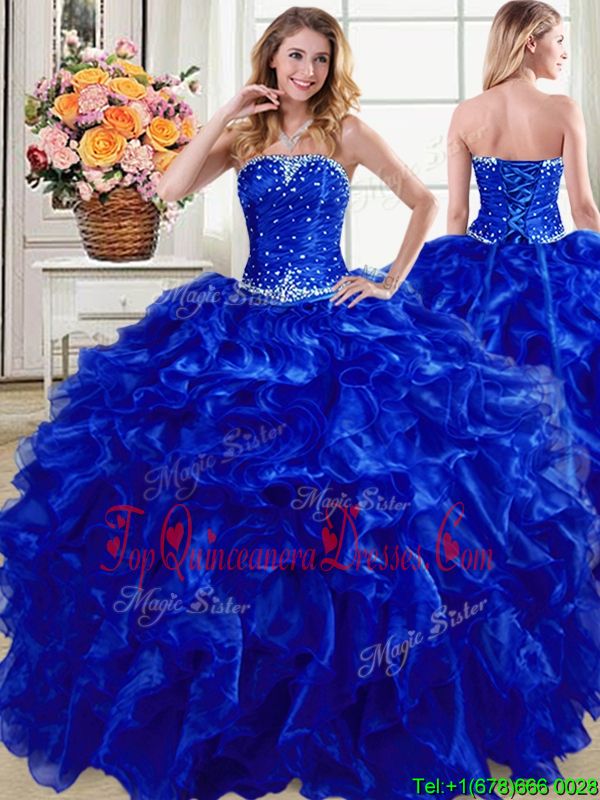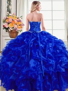 Discount Royal Blue Ball Gowns Strapless Sleeveless Organza Floor Length Lace Up Beading and Ruffles Quinceanera Gown