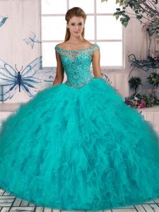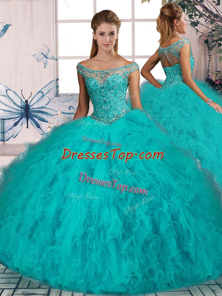 Discount Sleeveless Brush Train Lace Up Beading and Ruffles Quince Ball Gowns