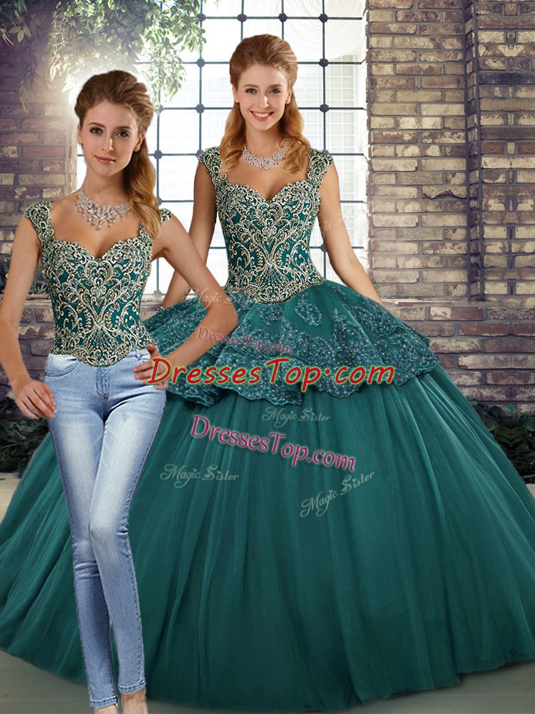 Discount Sleeveless Tulle Floor Length Lace Up 15th Birthday Dress in Green with Beading and Appliques