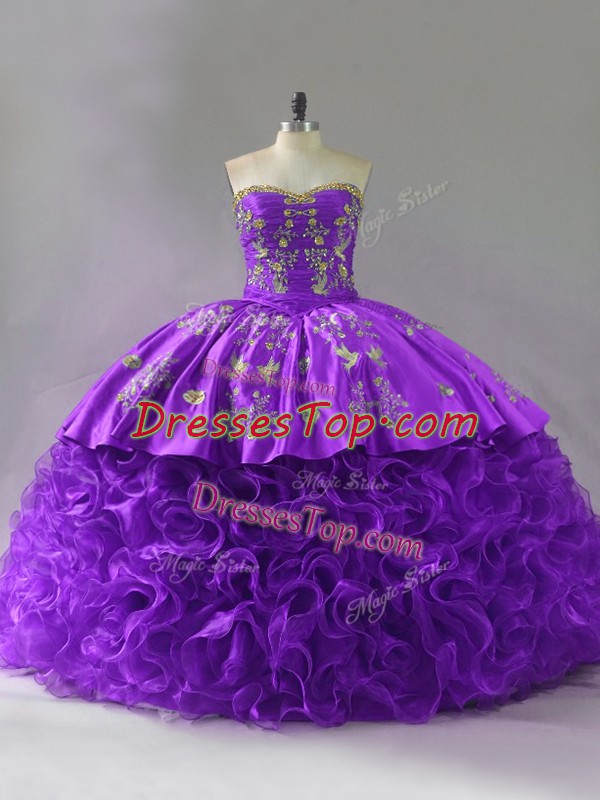 Discount Sweetheart Sleeveless Brush Train Lace Up Quince Ball Gowns Purple Fabric With Rolling Flowers