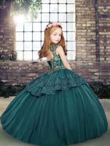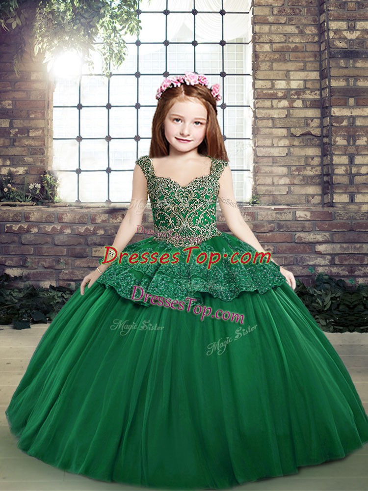 Discount Tulle Straps Sleeveless Lace Up Beading and Lace Little Girl Pageant Gowns in Dark Green
