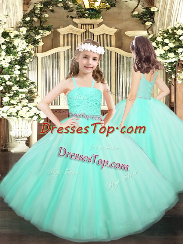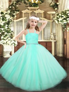 Dramatic Apple Green Tulle Zipper Straps Sleeveless Floor Length Child Pageant Dress Beading and Lace