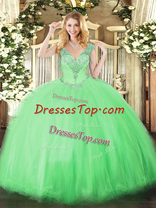 Dramatic Apple Green V-neck Neckline Beading 15 Quinceanera Dress Sleeveless Lace Up