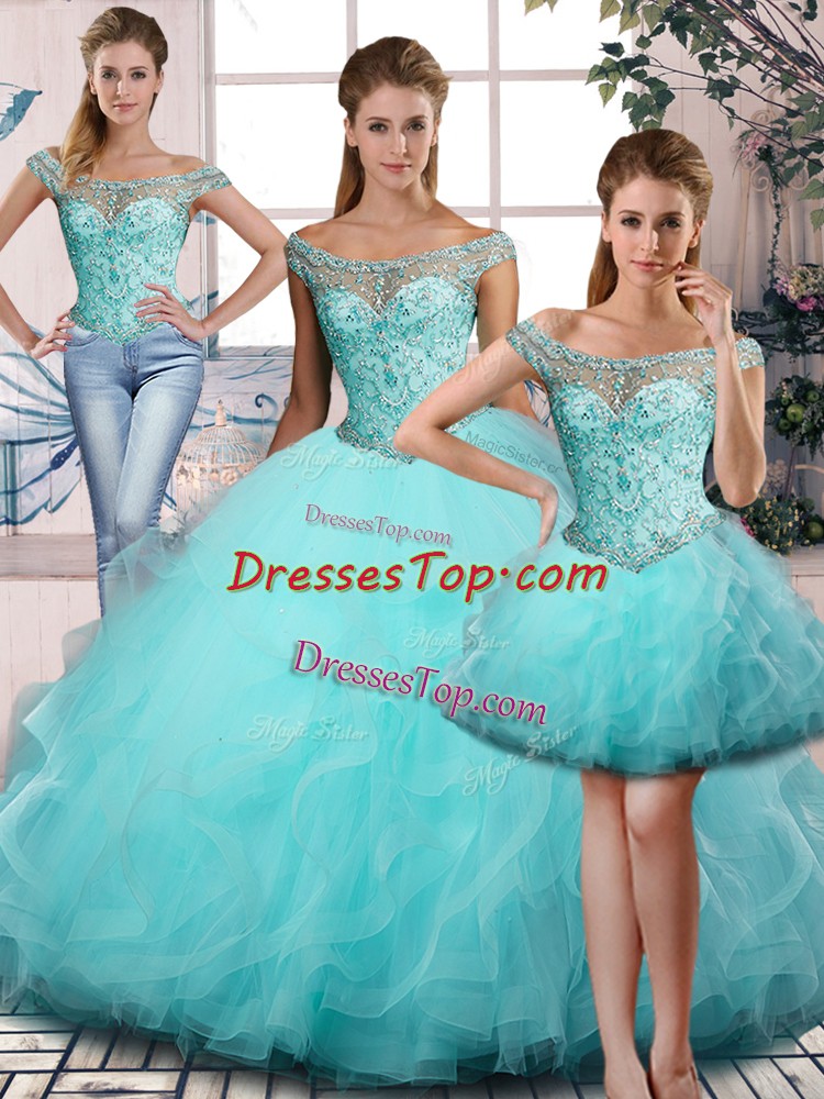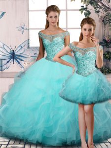 Dramatic Aqua Blue Ball Gowns Beading and Ruffles Quinceanera Dresses Lace Up Tulle Sleeveless
