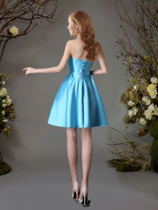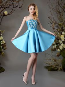 Dramatic Baby Blue Satin Lace Up Strapless Sleeveless Mini Length Vestidos de Damas Appliques and Bowknot