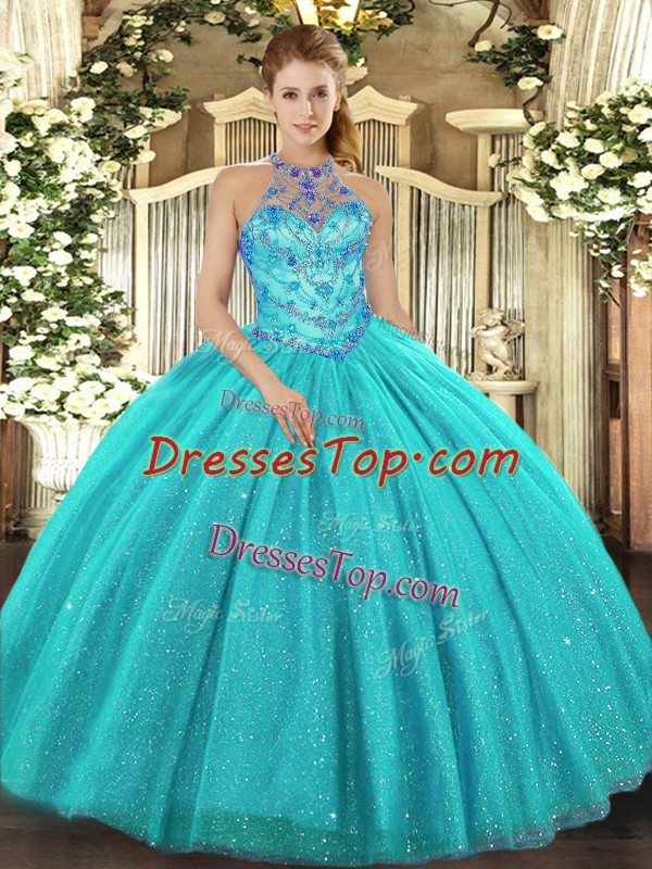 Dramatic Floor Length Aqua Blue Quince Ball Gowns Tulle Sleeveless Beading and Embroidery