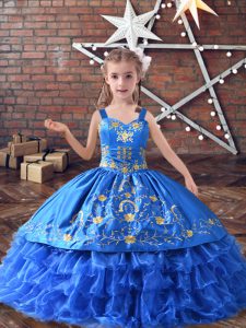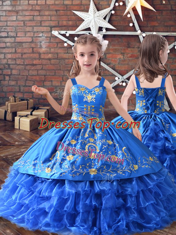 Dramatic Floor Length Ball Gowns Sleeveless Royal Blue Little Girls Pageant Dress Lace Up