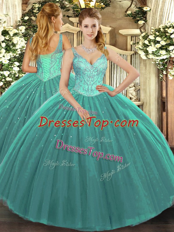 Dramatic Floor Length Turquoise Quinceanera Dresses V-neck Sleeveless Lace Up
