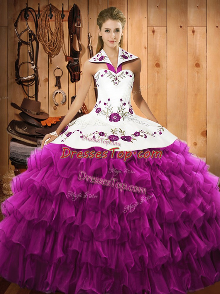 Dramatic Halter Top Sleeveless Satin and Organza Sweet 16 Dress Embroidery and Ruffled Layers Lace Up