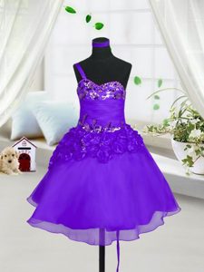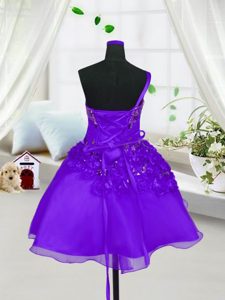 Dramatic Knee Length Lace Up Little Girls Pageant Dress Eggplant Purple and In for Party and Wedding Party with Beading and Hand Made Flower