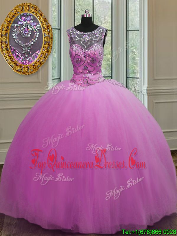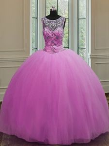 Dramatic Lilac Ball Gowns Tulle Scoop Sleeveless Beading Floor Length Lace Up Quinceanera Gown
