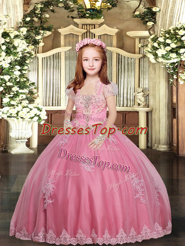 Dramatic Pink Ball Gowns Tulle Straps Sleeveless Appliques Floor Length Lace Up Little Girls Pageant Dress Wholesale