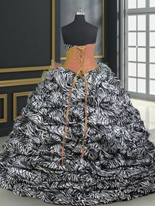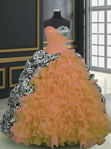 Dramatic Printed Orange Quinceanera Gown Military Ball and Sweet 16 and Quinceanera and For with Beading and Ruffles and Pattern Sweetheart Sleeveless Brush Train Lace Up