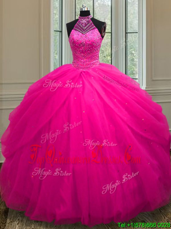 Dramatic Sequins Ball Gowns Quinceanera Gowns Hot Pink Halter Top Tulle Sleeveless Floor Length Lace Up