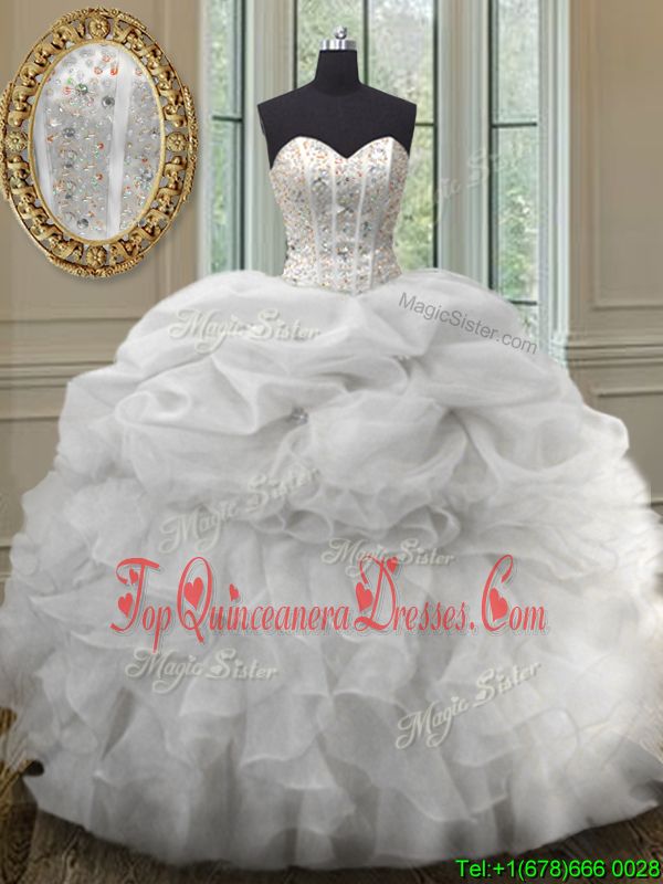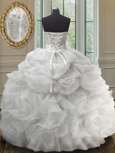 Dramatic Sleeveless Organza Floor Length Lace Up Quinceanera Gowns in White for with Beading and Ruffles