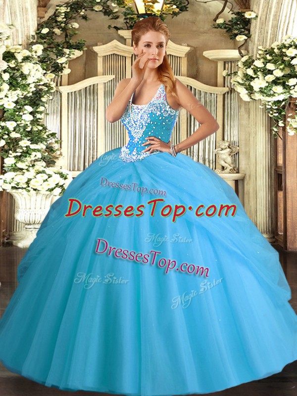 Dramatic Tulle Sleeveless Floor Length 15th Birthday Dress and Beading and Pick Ups