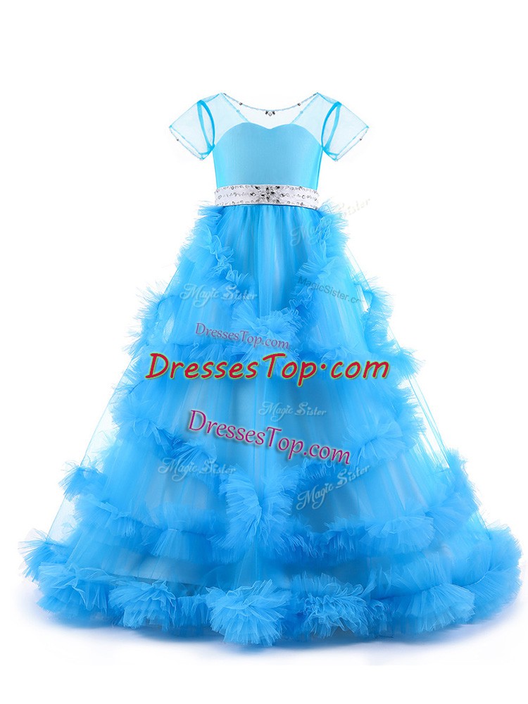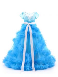 Dramatic Tulle V-neck Short Sleeves Backless Beading and Ruffles Little Girls Pageant Gowns in Baby Blue