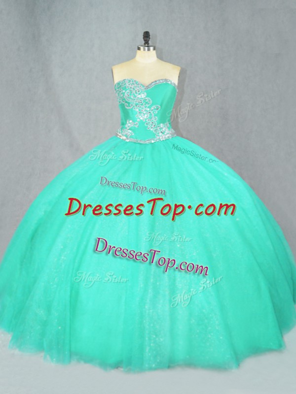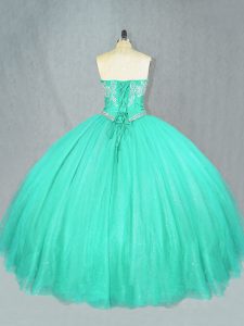 Dramatic Turquoise Ball Gowns Tulle Sweetheart Sleeveless Beading Floor Length Lace Up Quinceanera Gown