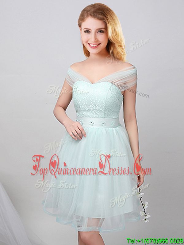 Dynamic A-line Vestidos de Damas Apple Green Off The Shoulder Tulle Short Sleeves Mini Length Lace Up