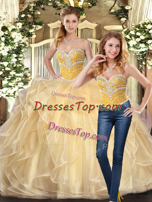 Dynamic Champagne Ball Gowns Sweetheart Sleeveless Organza Floor Length Lace Up Beading and Ruffles Quinceanera Dresses