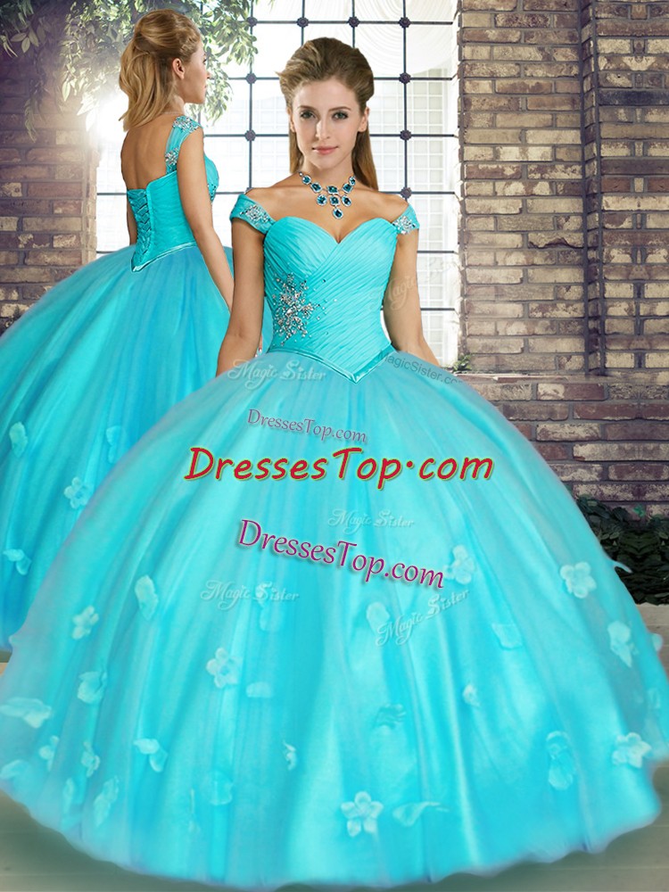Dynamic Floor Length Aqua Blue Quinceanera Dress Off The Shoulder Sleeveless Lace Up