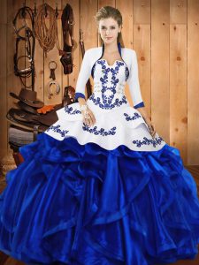 Dynamic Floor Length Lace Up Sweet 16 Dresses Blue for Military Ball and Sweet 16 and Quinceanera with Embroidery and Ruffles