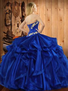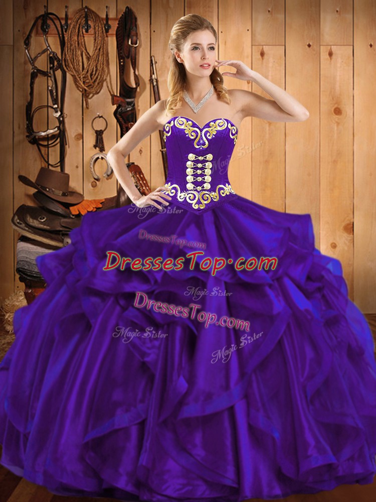 Dynamic Purple Ball Gowns Sweetheart Sleeveless Organza Floor Length Lace Up Embroidery and Ruffles 15 Quinceanera Dress