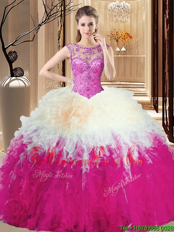 Dynamic Sleeveless Floor Length Beading and Ruffles Backless 15 Quinceanera Dress with Multi-color