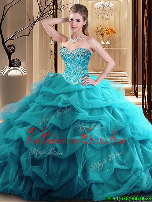 Dynamic Teal Tulle Zipper Sweet 16 Dress Sleeveless Floor Length Beading and Ruffles