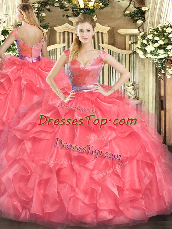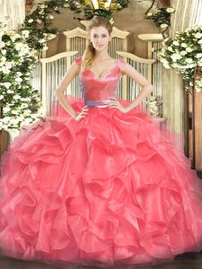 Edgy Beading and Ruffles Ball Gown Prom Dress Coral Red Zipper Sleeveless Floor Length