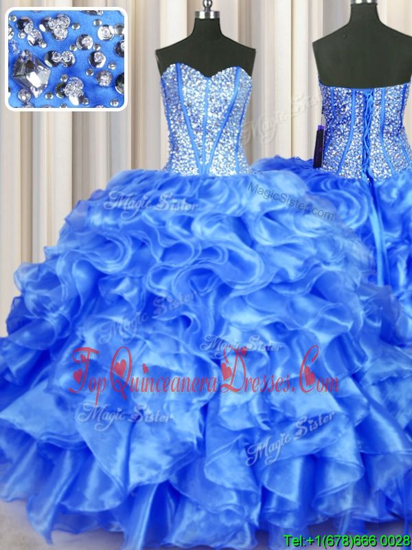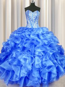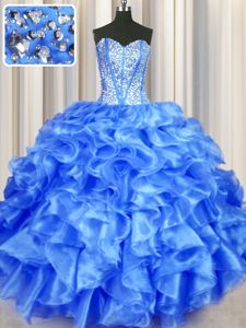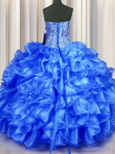 Edgy Blue Ball Gowns Organza Sweetheart Sleeveless Beading and Ruffles Floor Length Lace Up Sweet 16 Dresses