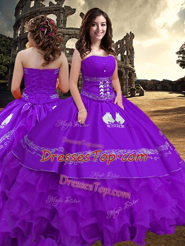 Edgy Floor Length Purple Quince Ball Gowns Taffeta Sleeveless Embroidery and Ruffled Layers