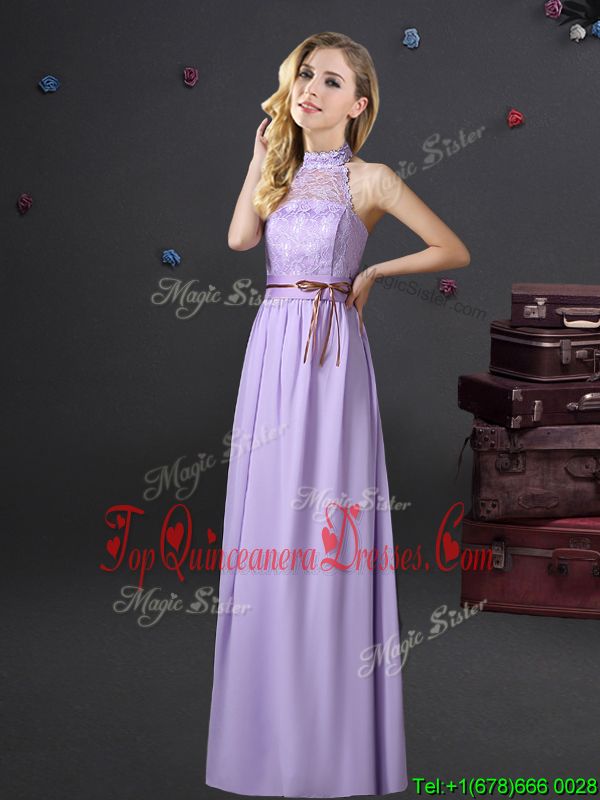 Edgy Lavender Empire Chiffon Halter Top Sleeveless Lace and Belt Floor Length Lace Up Dama Dress