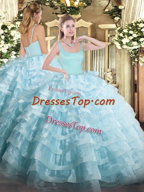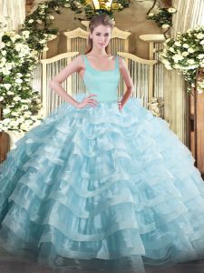 Edgy Light Blue Zipper Straps Beading and Ruffled Layers Quinceanera Dresses Organza Sleeveless