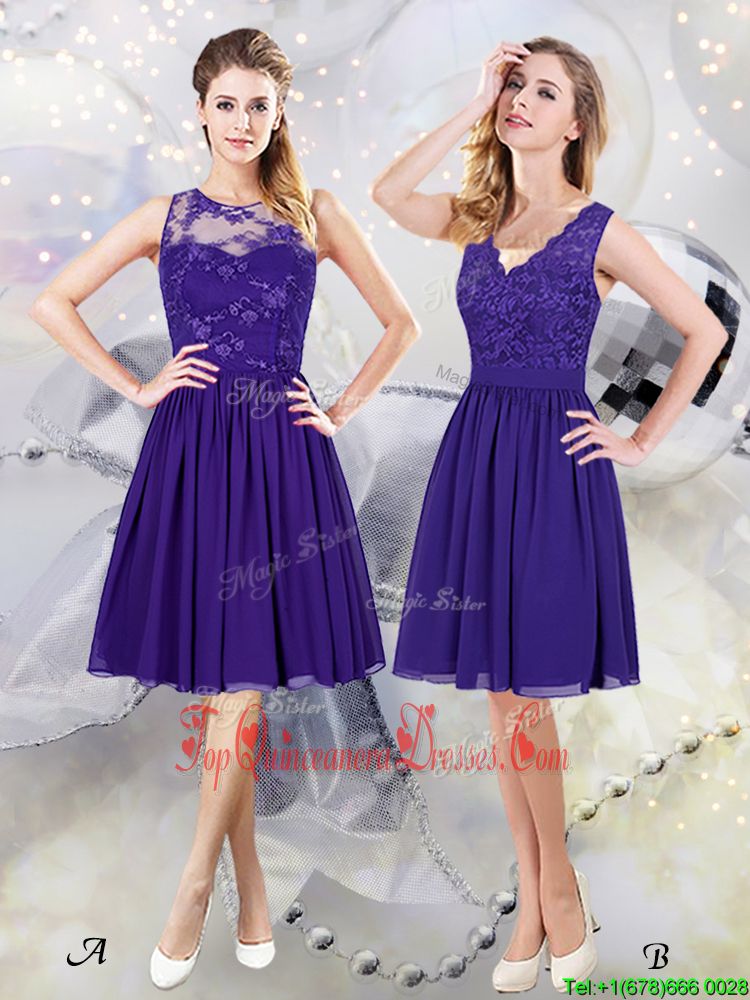 Edgy Scoop See Through Purple Sleeveless Lace and Appliques Knee Length Vestidos de Damas