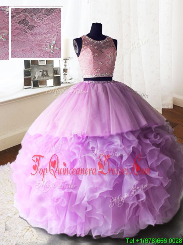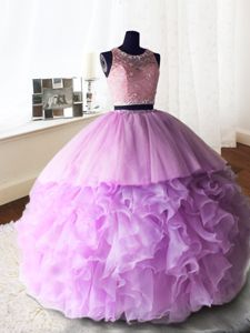 Edgy Scoop Sleeveless Brush Train Zipper Sweet 16 Dress Lilac Organza and Tulle and Lace