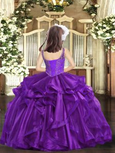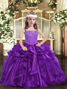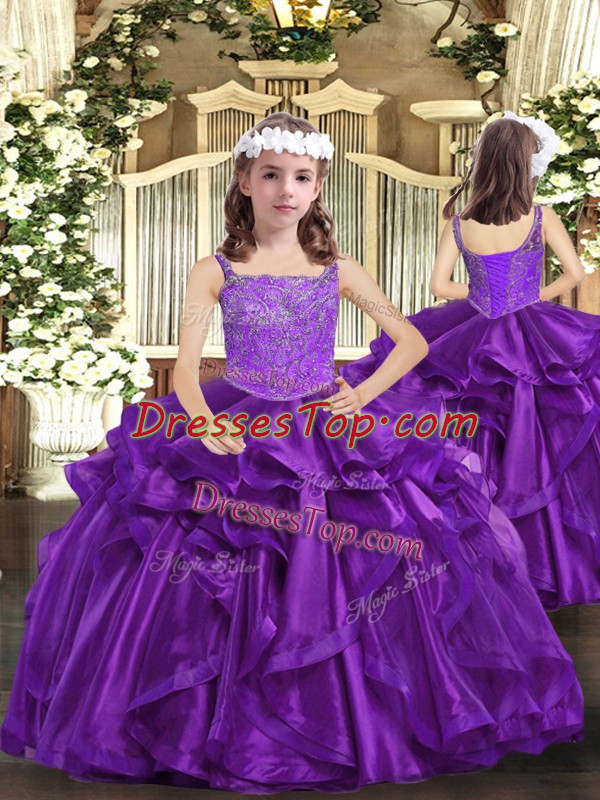 Eggplant Purple and Purple Organza Lace Up Straps Sleeveless Floor Length Little Girls Pageant Dress Beading