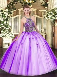 Eggplant Purple Ball Gowns Halter Top Sleeveless Tulle Floor Length Lace Up Beading Ball Gown Prom Dress