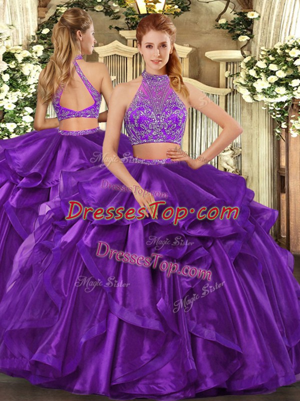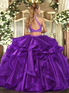 Eggplant Purple Halter Top Criss Cross Beading and Ruffled Layers Sweet 16 Quinceanera Dress Sleeveless
