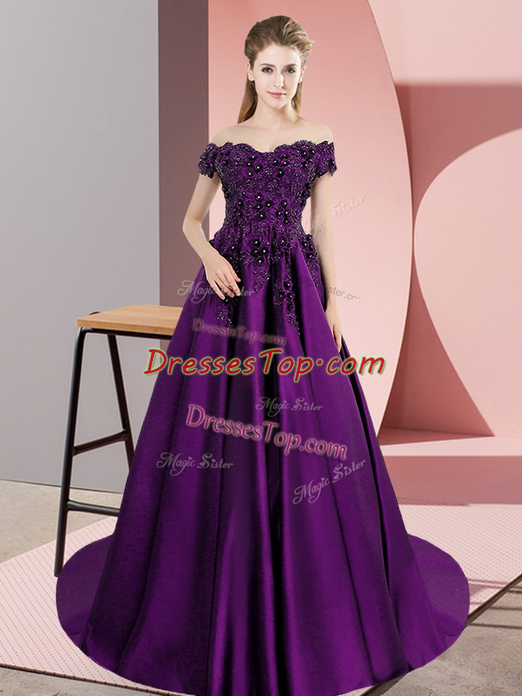 Eggplant Purple Zipper Off The Shoulder Appliques Quinceanera Dress Satin Sleeveless Court Train