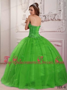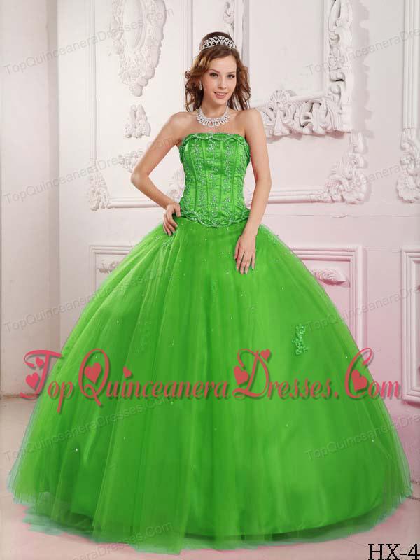 Elegant Ball Gown Strapless Floor-length Tulle Beading Spring Green Quinceanera Dress