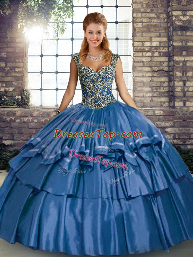 Elegant Blue Straps Neckline Beading and Ruffled Layers Sweet 16 Quinceanera Dress Sleeveless Lace Up