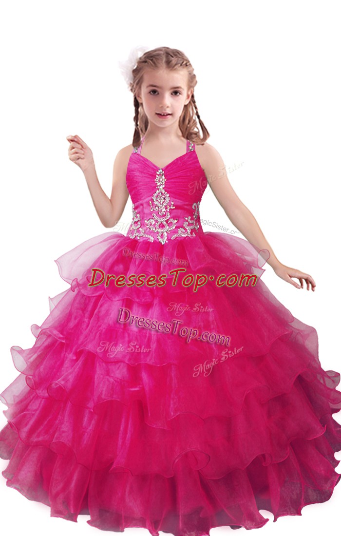 Elegant Floor Length Fuchsia Pageant Dress for Womens V-neck Sleeveless Zipper