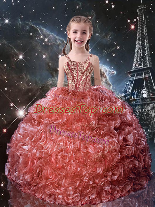 Elegant Floor Length Watermelon Red Little Girl Pageant Dress Organza Sleeveless Beading and Ruffles