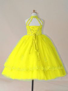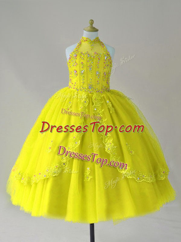 Elegant Floor Length Yellow Pageant Gowns For Girls High-neck Sleeveless Lace Up