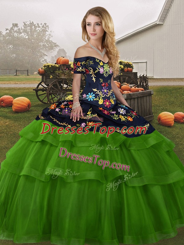 Elegant Green Sleeveless Brush Train Embroidery and Ruffled Layers 15th Birthday Dress