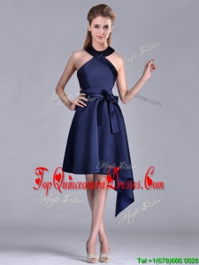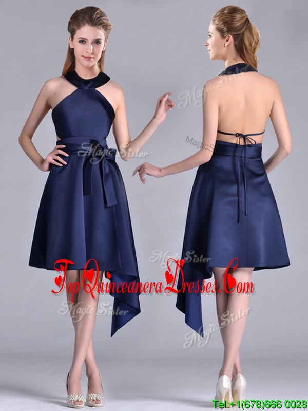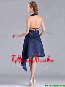 Elegant Halter Top Asymmetrical Navy Blue Dama Dress in Satin